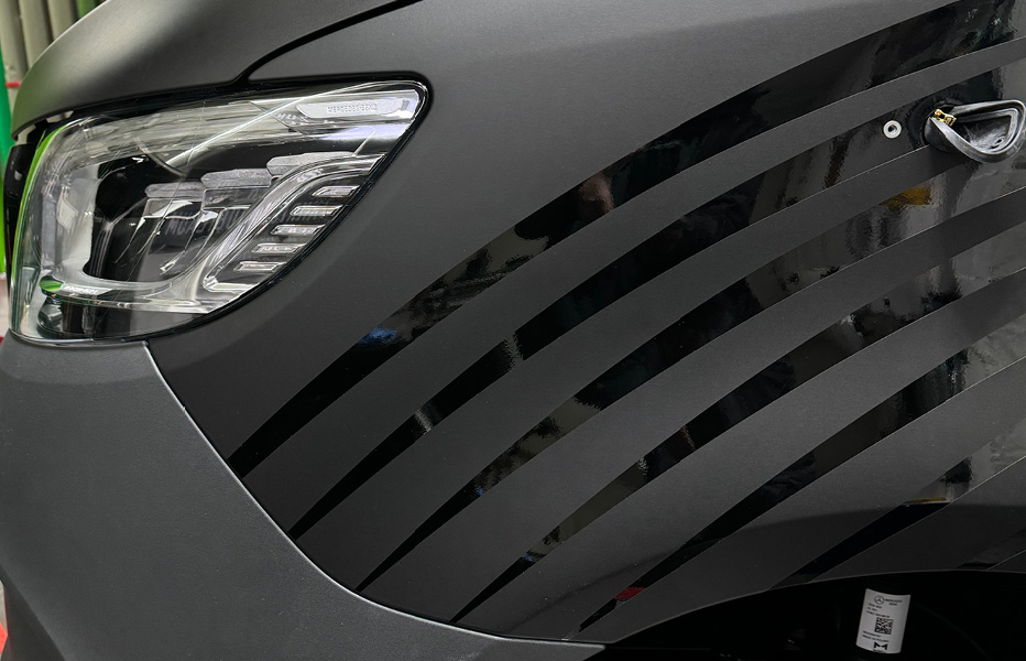 Seitenansicht Fiat Ducato Campervan mit Wellendesign-Folierung auf schwarzer Grundlage